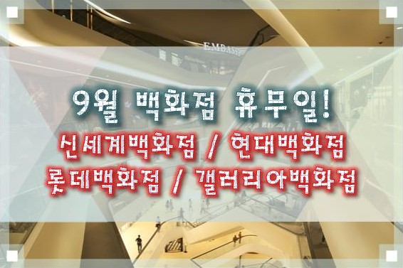 | 9월 신세계 백화점 / 현대백화점 / 롯데백화점 / 갤러리아백화점 휴무일! (0) | 2023.09.01 |
